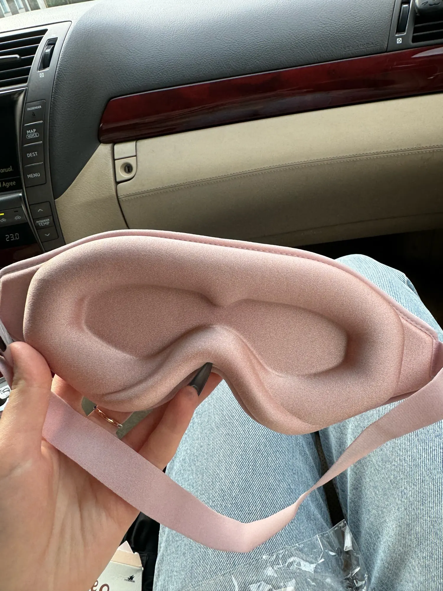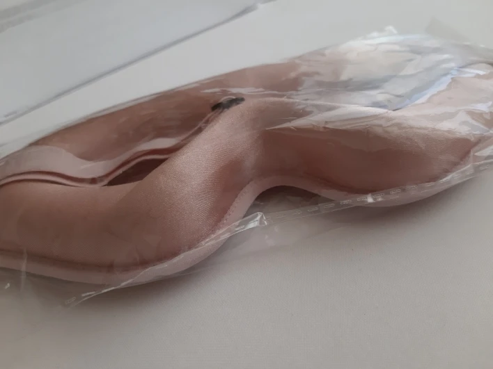 Fast shipping. The product matches the seller's photo and description. In my photo, the mask has already been used and washed. The mask is very soft, providing complete blackout on my small face. I bought it for sleeping on a plane but decided to test it at home. Now I sleep in it every night. At first, there is a slight pressure from the mask on my face, but I quickly got used to it. I also sleep on my side. I plan to buy a second one as a replacement while washing this one.