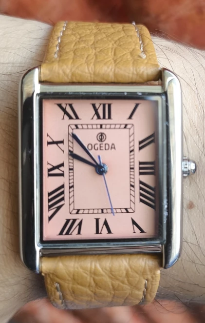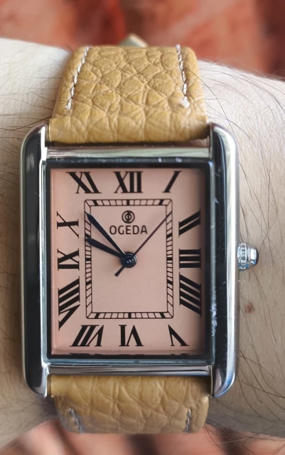 This is an homage to the cartier tank. It is unbelievably good value when compared to the original. I went for the salmon pink dial to make a change and it looks rather elegant.