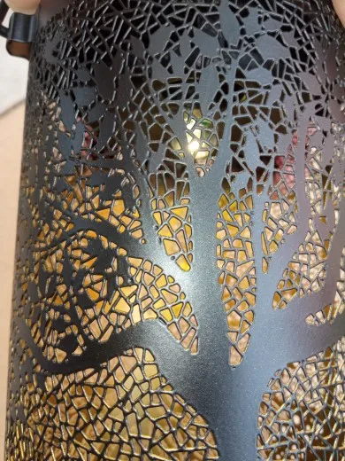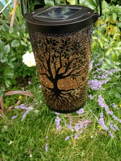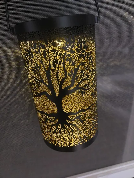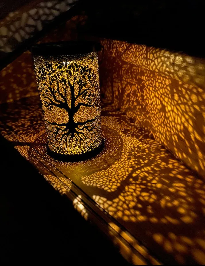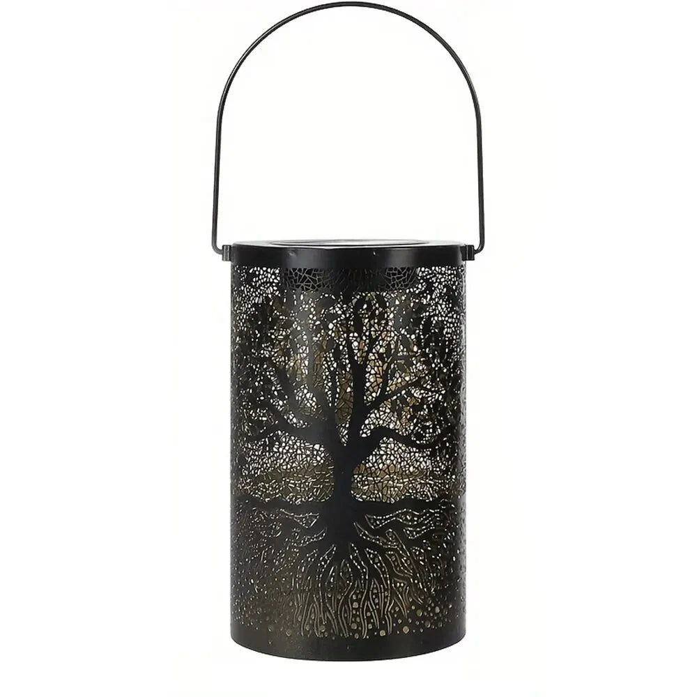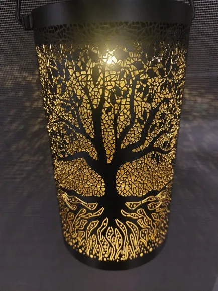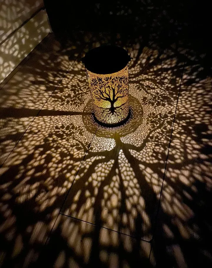 Intricately cut metal design casts a breathtaking 360° tree-of-life pattern across the ground and walls, creating a warm, artistic ambience in any outdoor space.